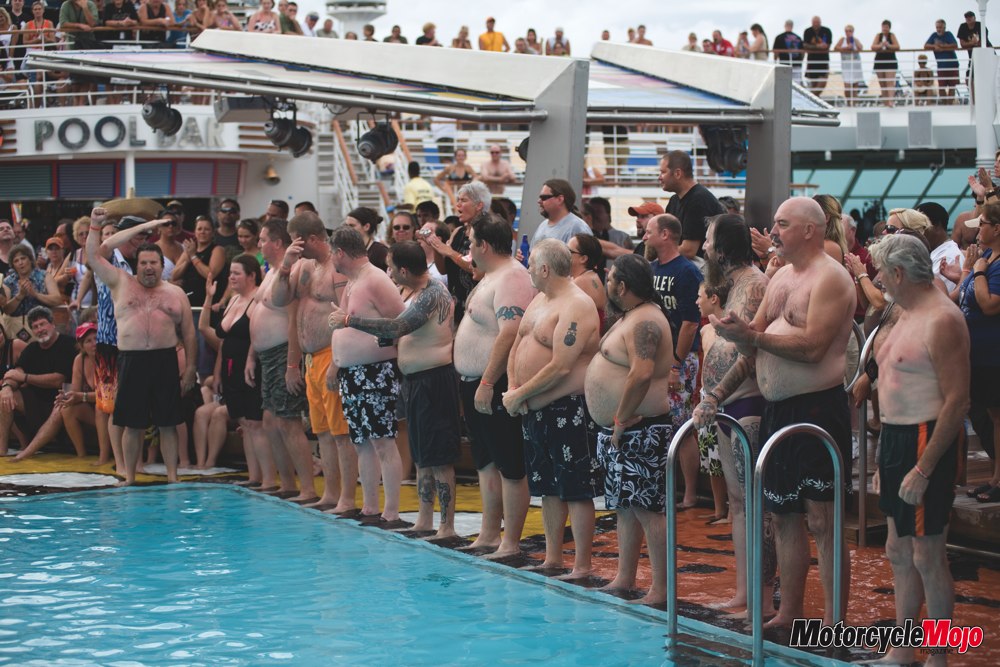 This particular evening was the Hogs on the High Seas Tattoo Contest with a dozen or so competing for the prize money and trophy. The way it works is you get $50 per tattoo that is a past or current Hogs on the High Seas logo with a cap of $250 per person to be won. As it turned out, this contest was so popular they had to cap the amount of money a few times as some were almost cashing in on enough to pay for their next cruise. The final winner receives an extra $500 and is determined by crowd applause and cheering.