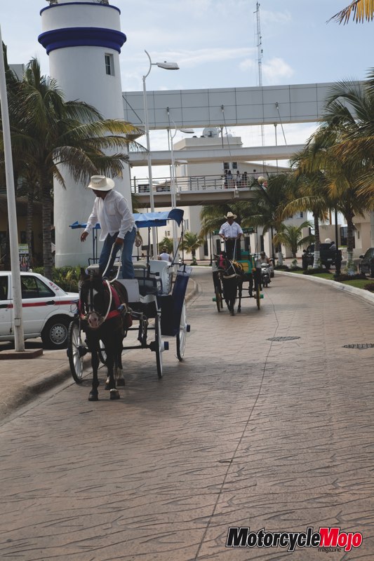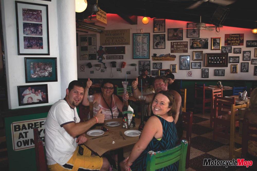 To give you an idea of the ensuing party at Carlos and Charlie’s, one can buy single drinks as normal or the alternative is buying hourly drink tickets. Tickets can be bought for one-hour, two-hour or five-hour segments, meaning if you buy a two-hour drink ticket, you drink what you want, or can, for those two-hours. One of our new friends, Alabama Lea decided the 5-hour drink ticket would be in her best interest. This was a very entertaining afternoon for many and even more so than we realized when we viewed our pictures the next day. One of the customs at this bar is for the waiters to walk up behind you, throw a large piece of craft paper over your head to protect your clothes, and when you’re ready, pour Sangria down your throat. You simply raise your hand to acknowledge when you’ve had enough. Or you can join the conga line and have your butt whacked and a shot of free tequila as you pass by the staff. Yes, this was the crazy party zone. We were encouraged to dance on our chairs and have a huge time. It’s also at this bar that a couple of Harleys are driven through the crowd. When you hear the motors roaring, you just stand up on your chair and make way for the bikes to pass by.