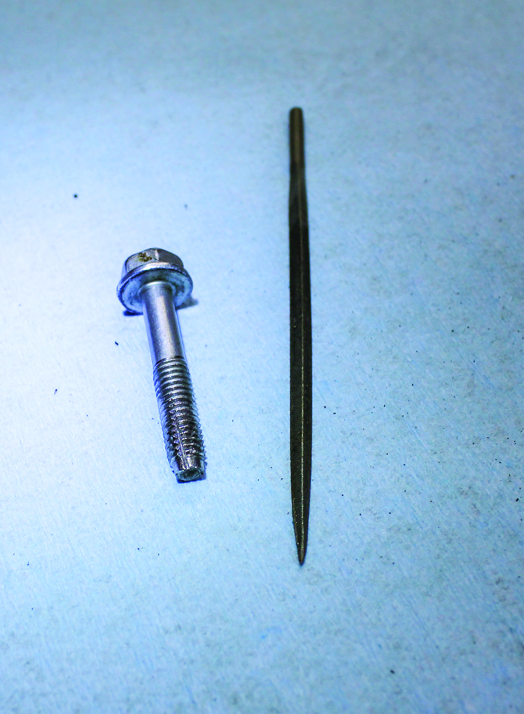 Instead, cut some grooves across the threads of a sacrificial bolt (keep it for future use) with a small triangular file, and use it to clean the threads. The spark plug hole in the ST90 was particularly stubborn; it took about five minutes just to remove the spark plug without damaging the threads. While it’s tempting to use an impact wrench to remove stubborn plugs, doing so can lead to disaster, since aluminum has a tendency to weld itself to the steel threads if you force the plug out, which will destroy the threads and require head surgery. I cut grooves into an old spark plug and used it to clean the threads.